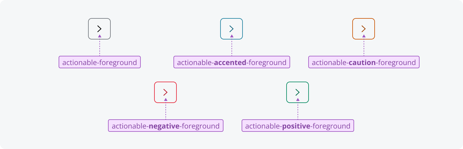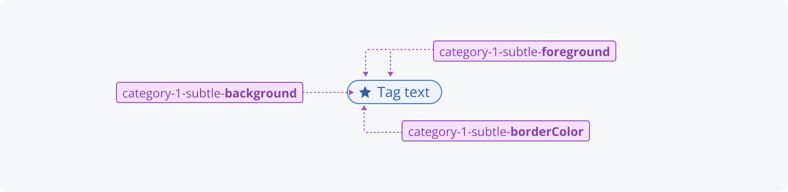 - Characteristic*: Included in all semantic tokens to group tokens that share the same purpose or function (e.g., accent, actionable, container, content).